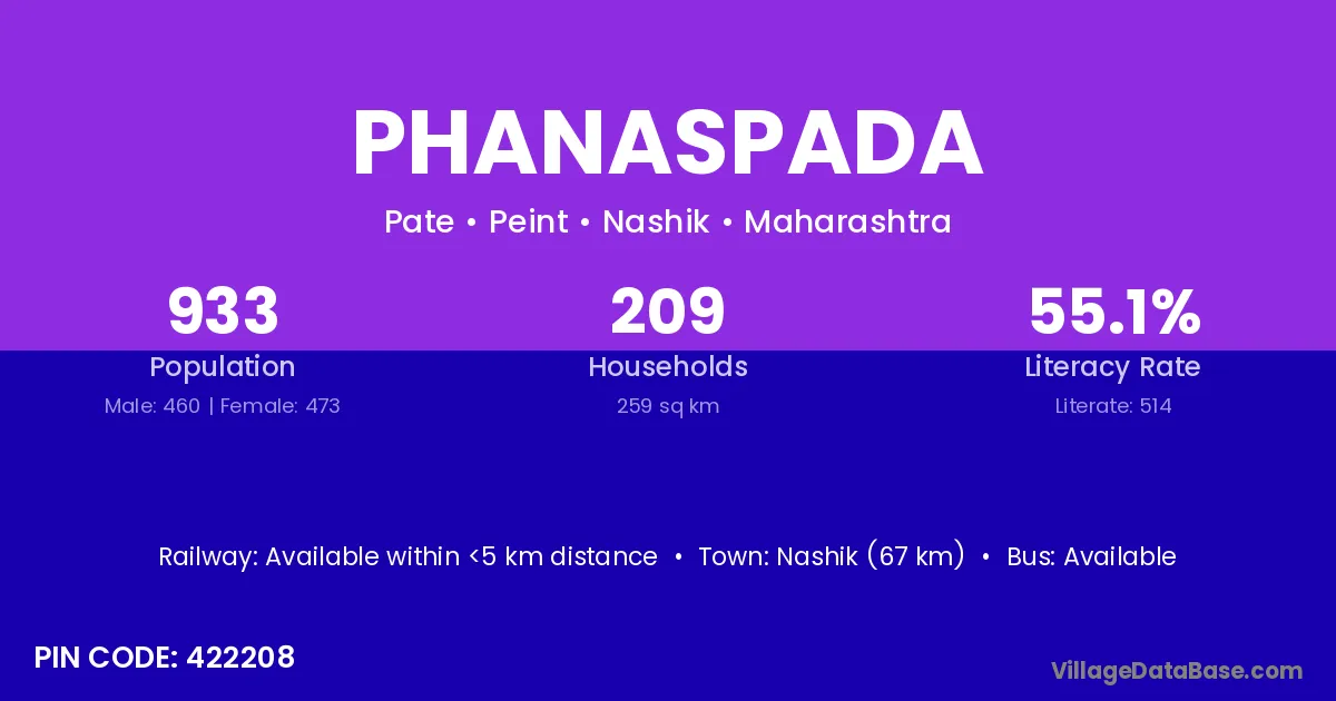 Nashik (67 km) is the nearest town to Phanaspada village for major economic activities and is located approximately 67 km away.