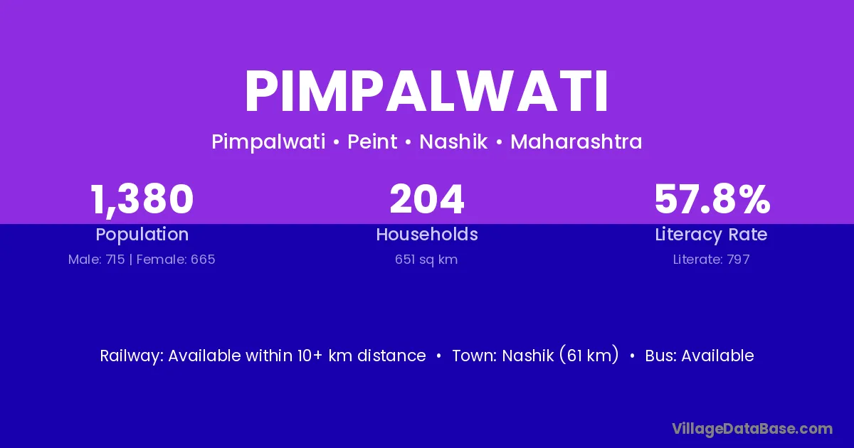 Pimpalwati village has a total population of 1,380 people, of which 715 are males and 665 are females.