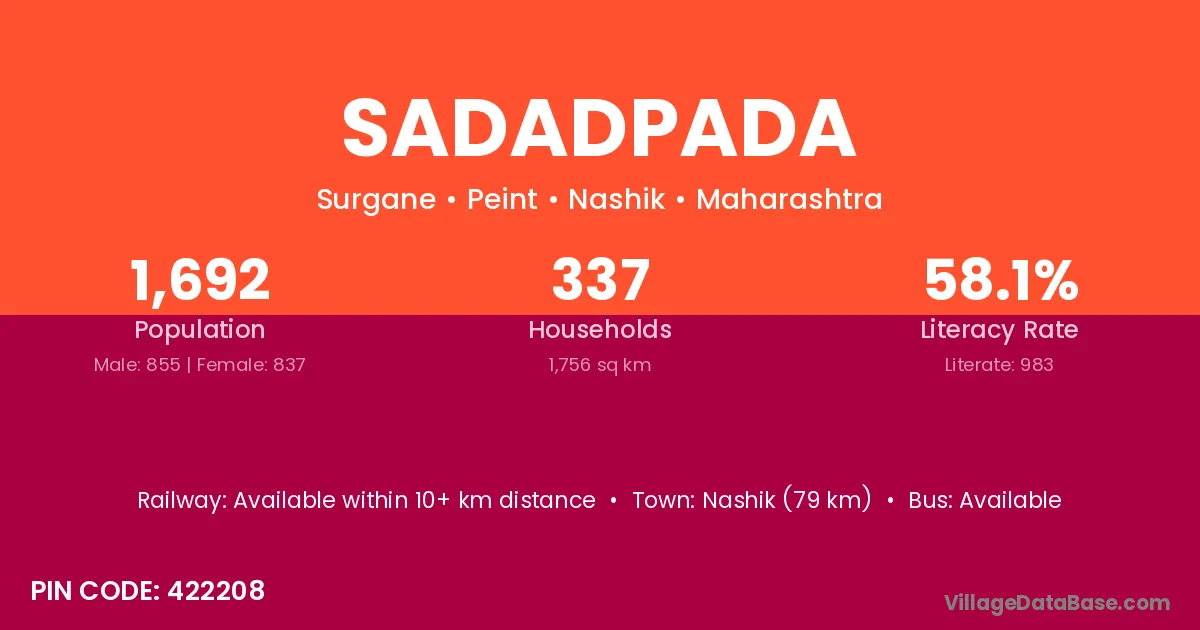 Sadadpada village has a total population of 1,692 people, of which 855 are males and 837 are females.
