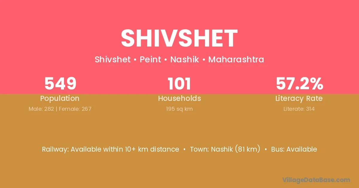 Nashik (81 km) is the nearest town to Shivshet village for major economic activities and is located approximately 81 km away.
