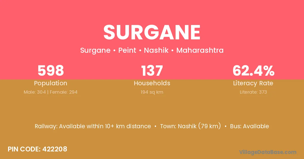Nashik (79 km) is the nearest town to Surgane village for major economic activities and is located approximately 79 km away.