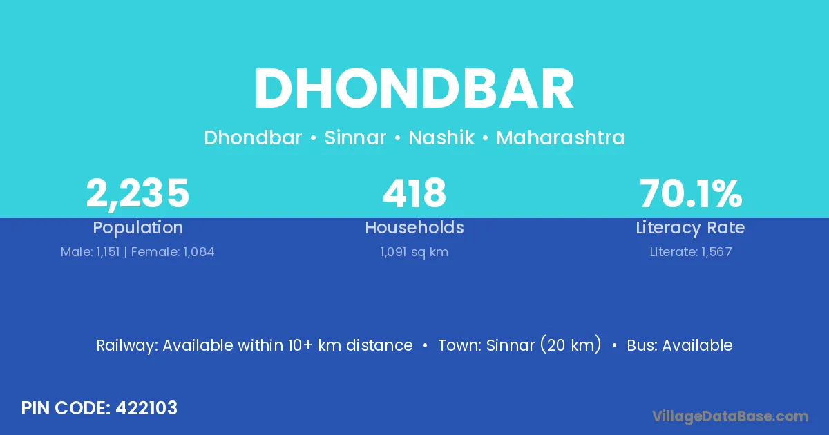 Sinnar (20 km) is the nearest town to Dhondbar village for major economic activities and is located approximately 20 km away.