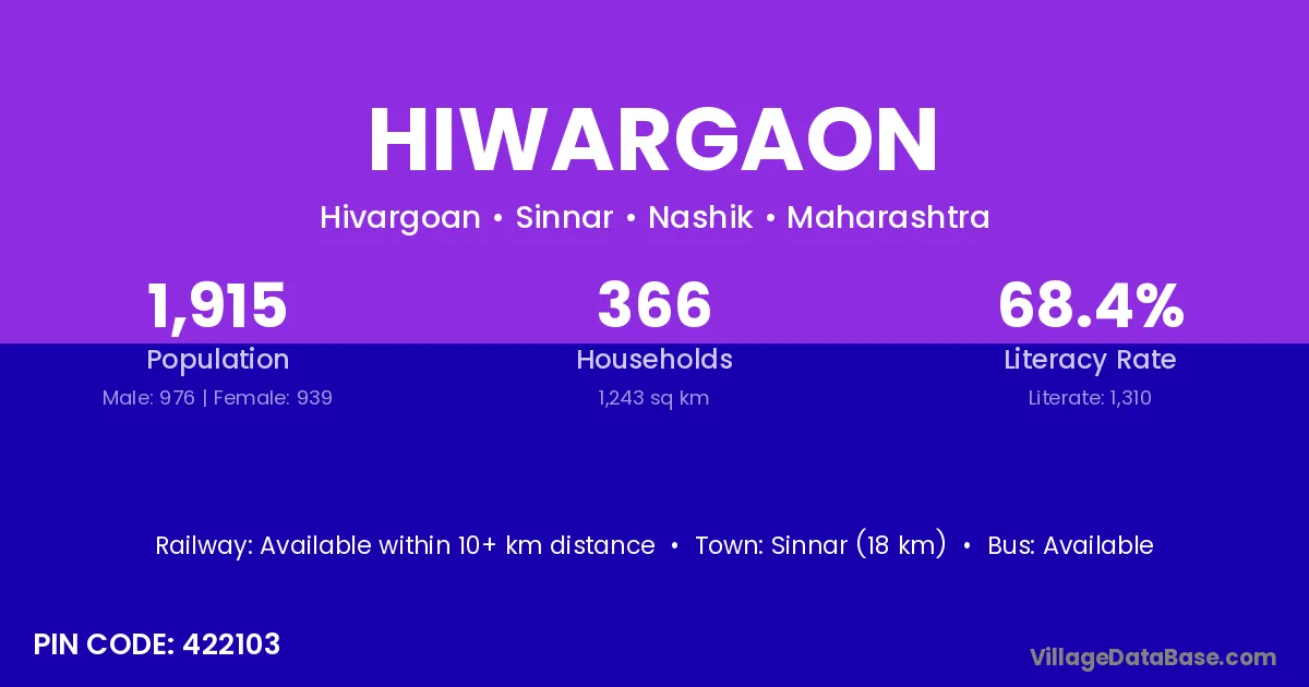 Sinnar (18 km) is the nearest town to Hiwargaon village for major economic activities and is located approximately 18 km away.