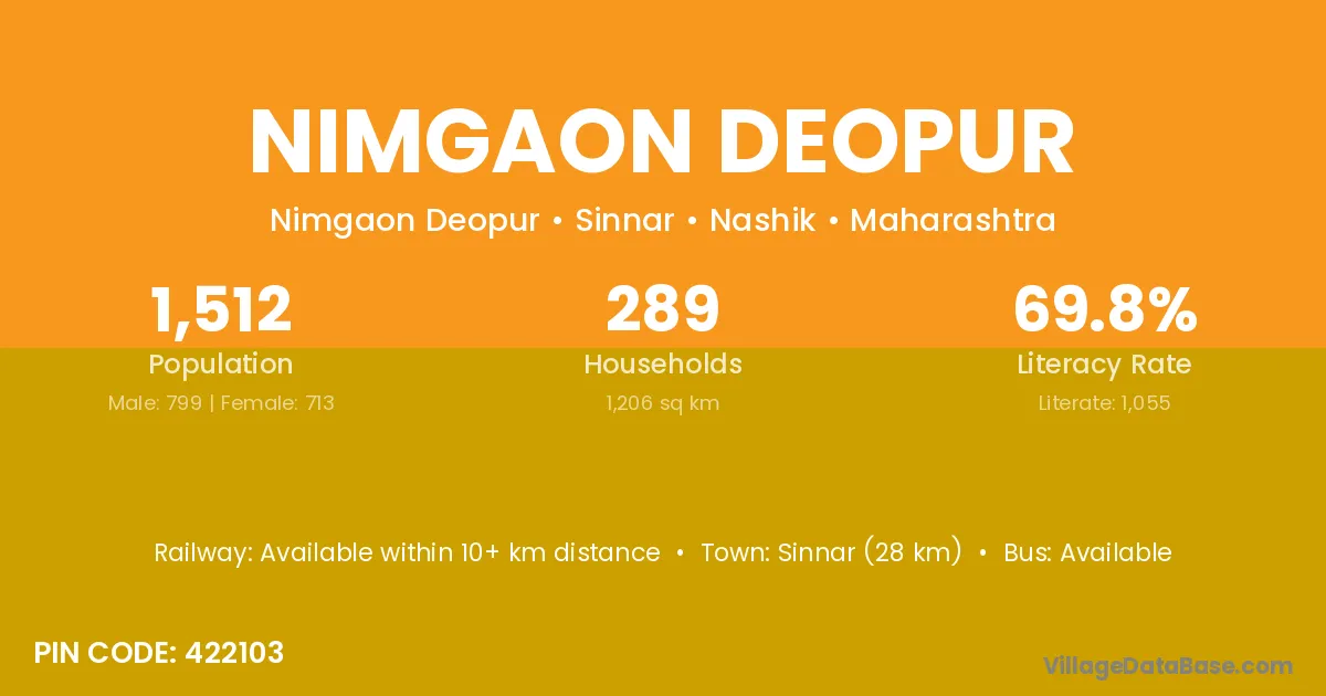 Sinnar (28 km) is the nearest town to Nimgaon Deopur village for major economic activities and is located approximately 28 km away.