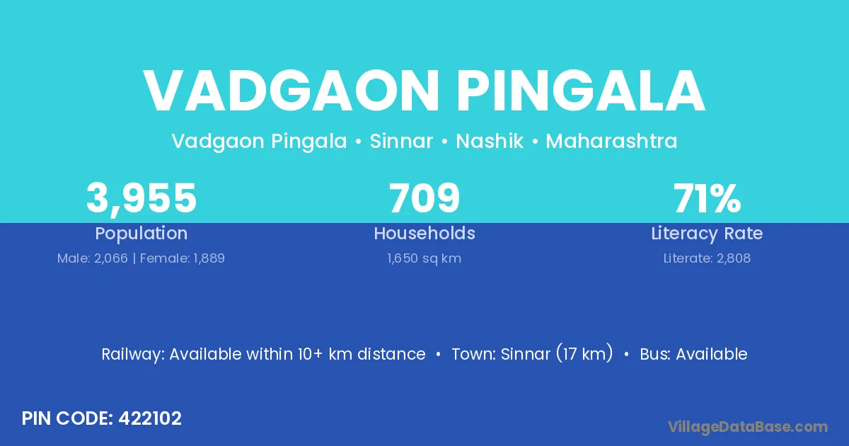 Sinnar (17 km) is the nearest town to Vadgaon Pingala village for major economic activities and is located approximately 17 km away.
