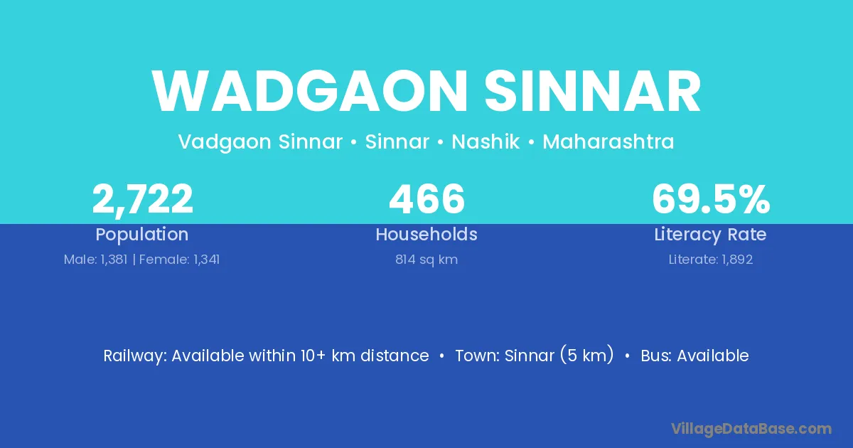 Sinnar (5 km) is the nearest town to Wadgaon Sinnar village for major economic activities and is located approximately 5 km away.