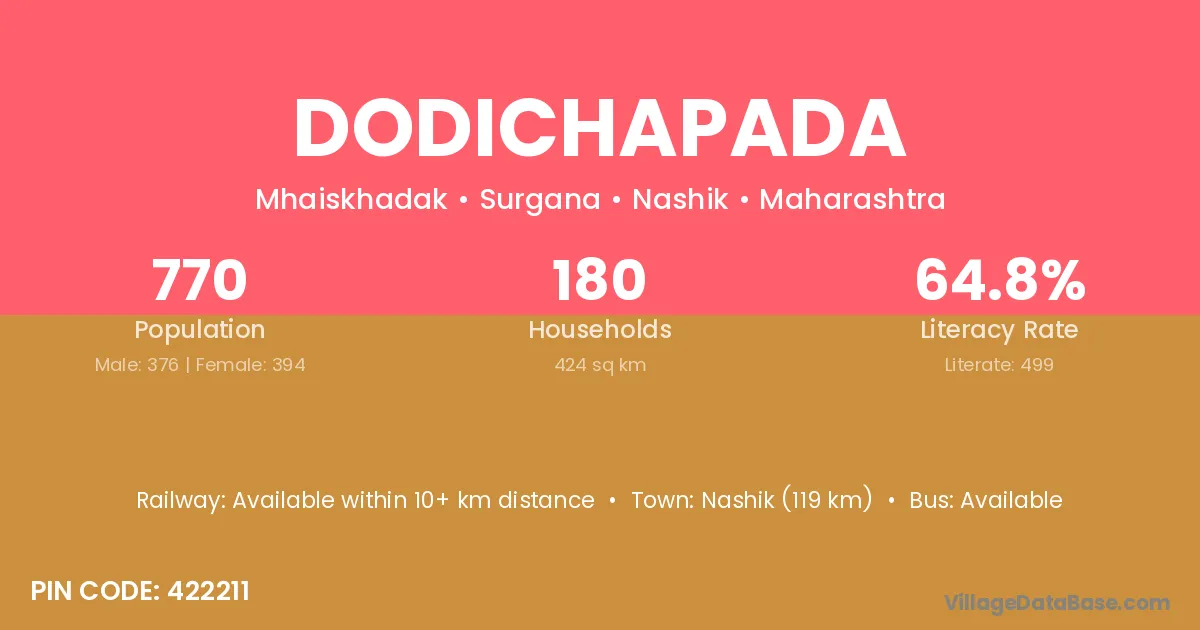 Nashik (119 km) is the nearest town to Dodichapada village for major economic activities and is located approximately 119 km away.