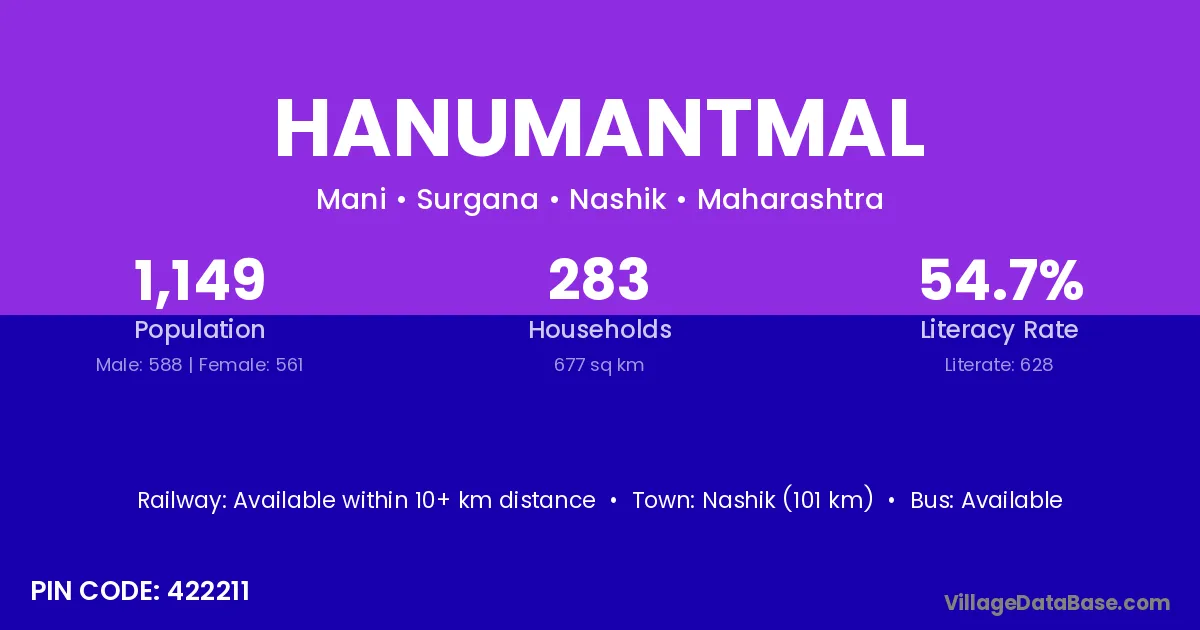 Nashik (101 km) is the nearest town to Hanumantmal village for major economic activities and is located approximately 101 km away.