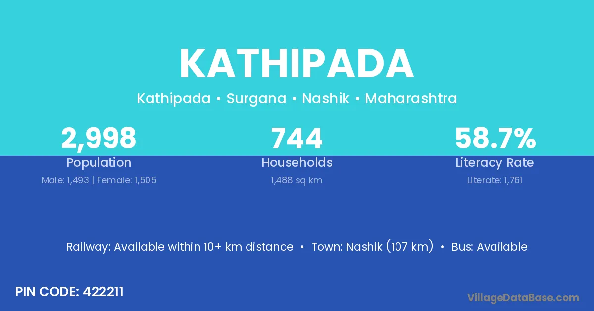 Nashik (107 km) is the nearest town to Kathipada village for major economic activities and is located approximately 107 km away.
