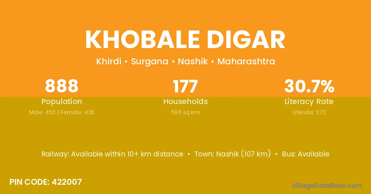 Nashik (107 km) is the nearest town to Khobale Digar village for major economic activities and is located approximately 107 km away.
