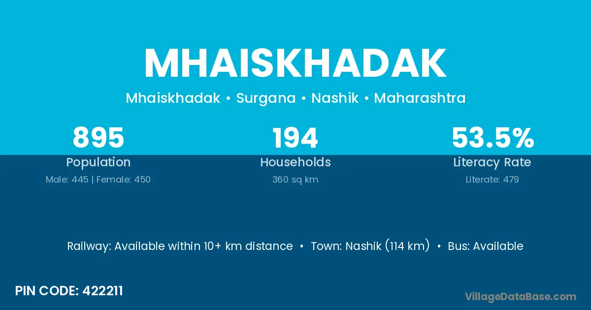Nashik (114 km) is the nearest town to Mhaiskhadak village for major economic activities and is located approximately 114 km away.