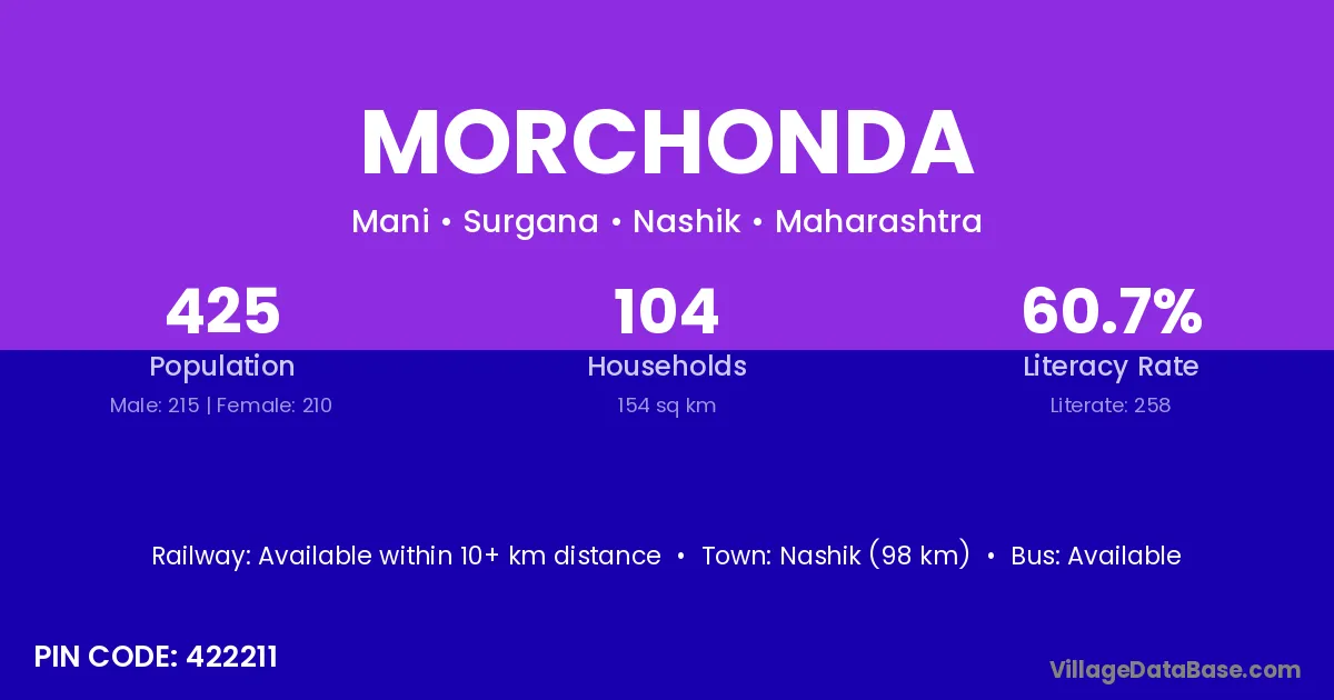 Nashik (98 km) is the nearest town to Morchonda village for major economic activities and is located approximately 98 km away.