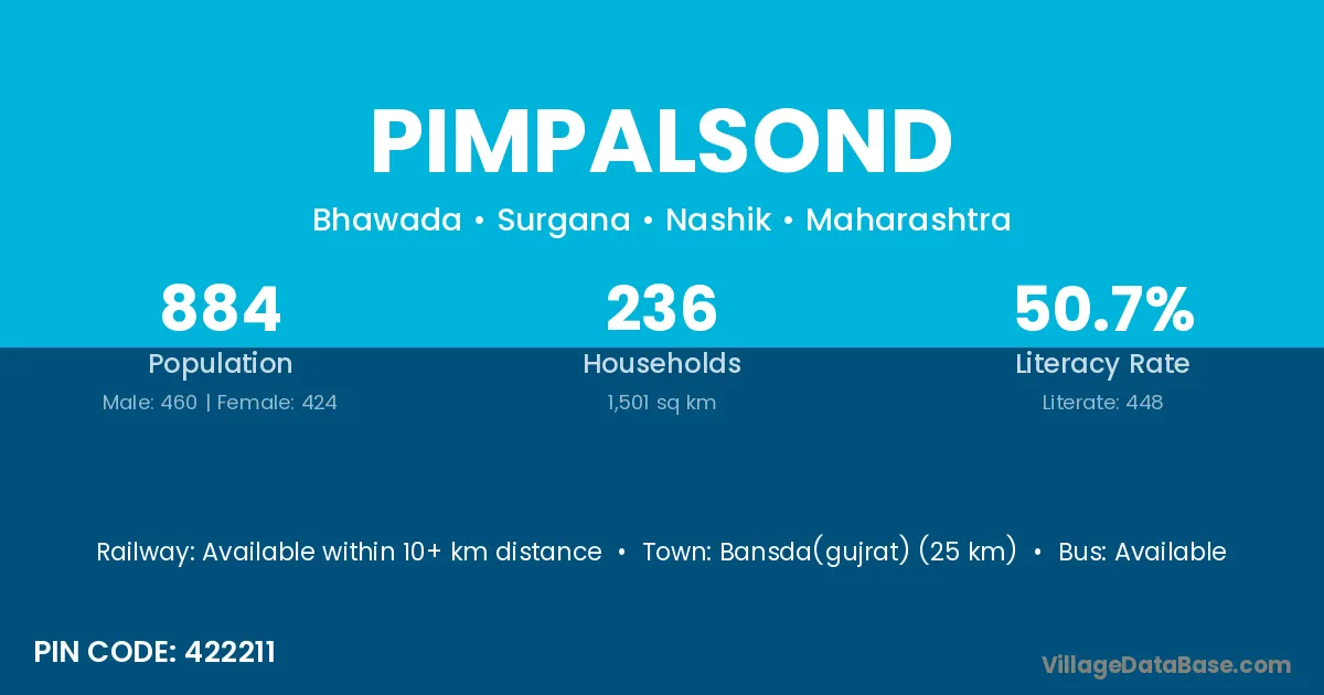 Bansda(gujrat) (25 km) is the nearest town to Pimpalsond village for major economic activities and is located approximately 25 km away.