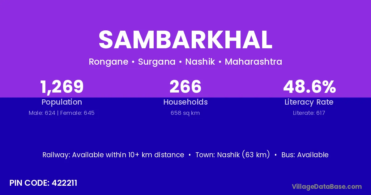 Nashik (63 km) is the nearest town to Sambarkhal village for major economic activities and is located approximately 63 km away.