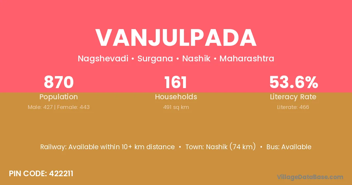 Vanjulpada village has a total population of 870 people, of which 427 are males and 443 are females.