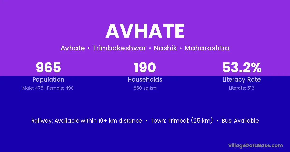 Trimbak (25 km) is the nearest town to Avhate village for major economic activities and is located approximately 25 km away.