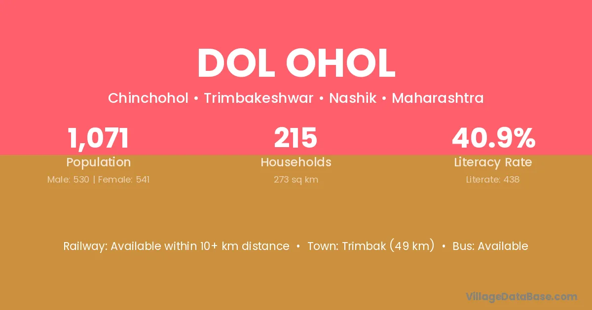 Trimbak (49 km) is the nearest town to Dol Ohol village for major economic activities and is located approximately 49 km away.