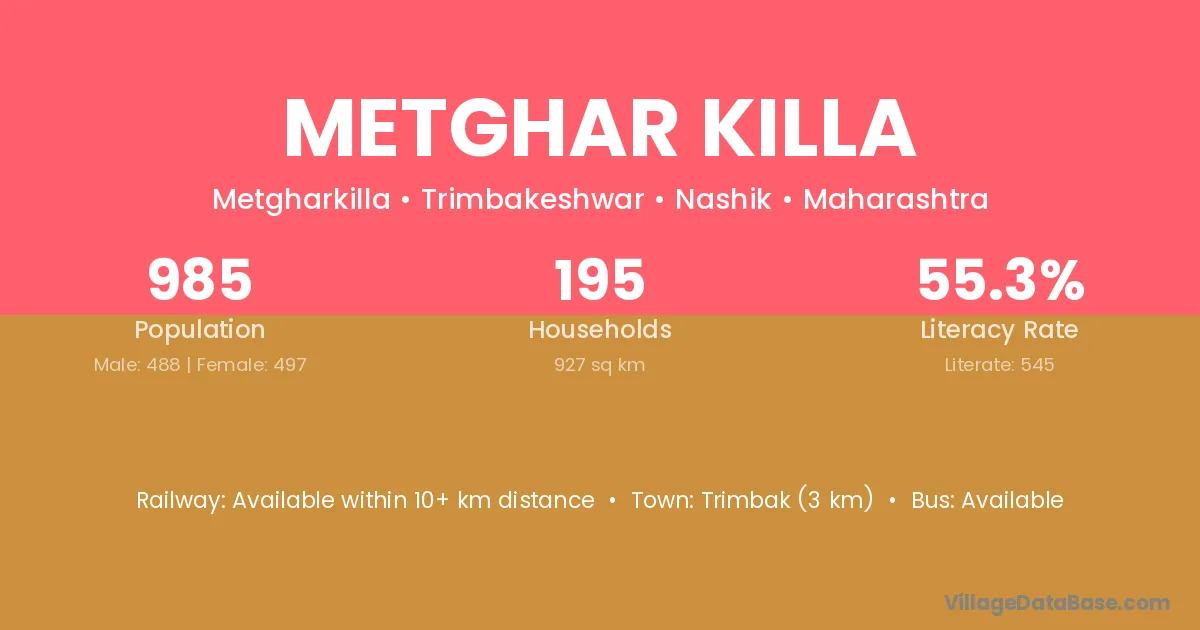 Trimbak (3 km) is the nearest town to Metghar Killa village for major economic activities and is located approximately 3 km away.