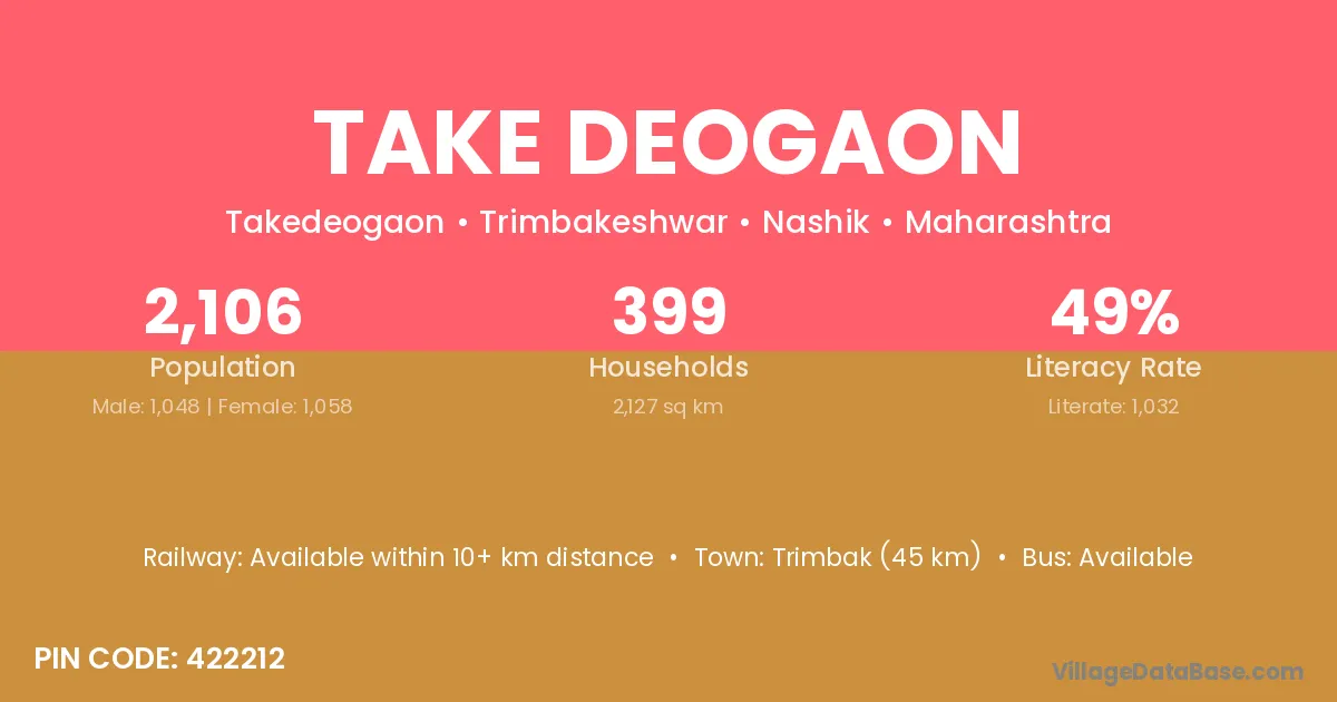 Trimbak (45 km) is the nearest town to Take Deogaon village for major economic activities and is located approximately 45 km away.