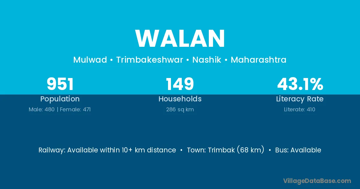 Trimbak (68 km) is the nearest town to Walan village for major economic activities and is located approximately 68 km away.