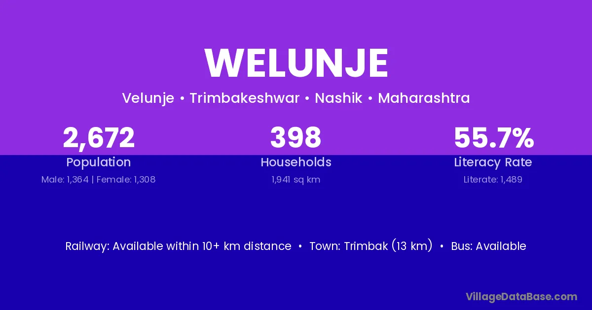 Trimbak (13 km) is the nearest town to Welunje village for major economic activities and is located approximately 13 km away.