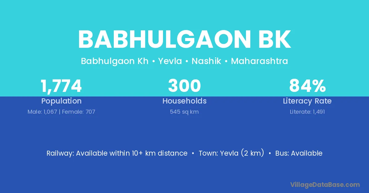 Yevla (2 km) is the nearest town to Babhulgaon Bk village for major economic activities and is located approximately 2 km away.