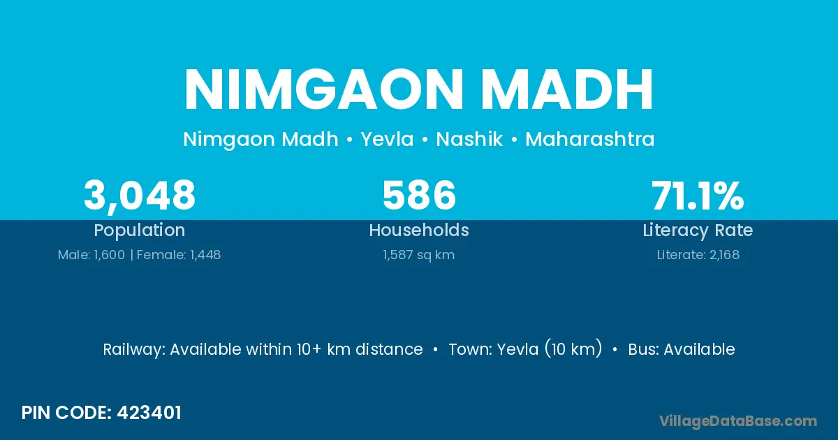 Yevla (10 km) is the nearest town to Nimgaon Madh village for major economic activities and is located approximately 10 km away.