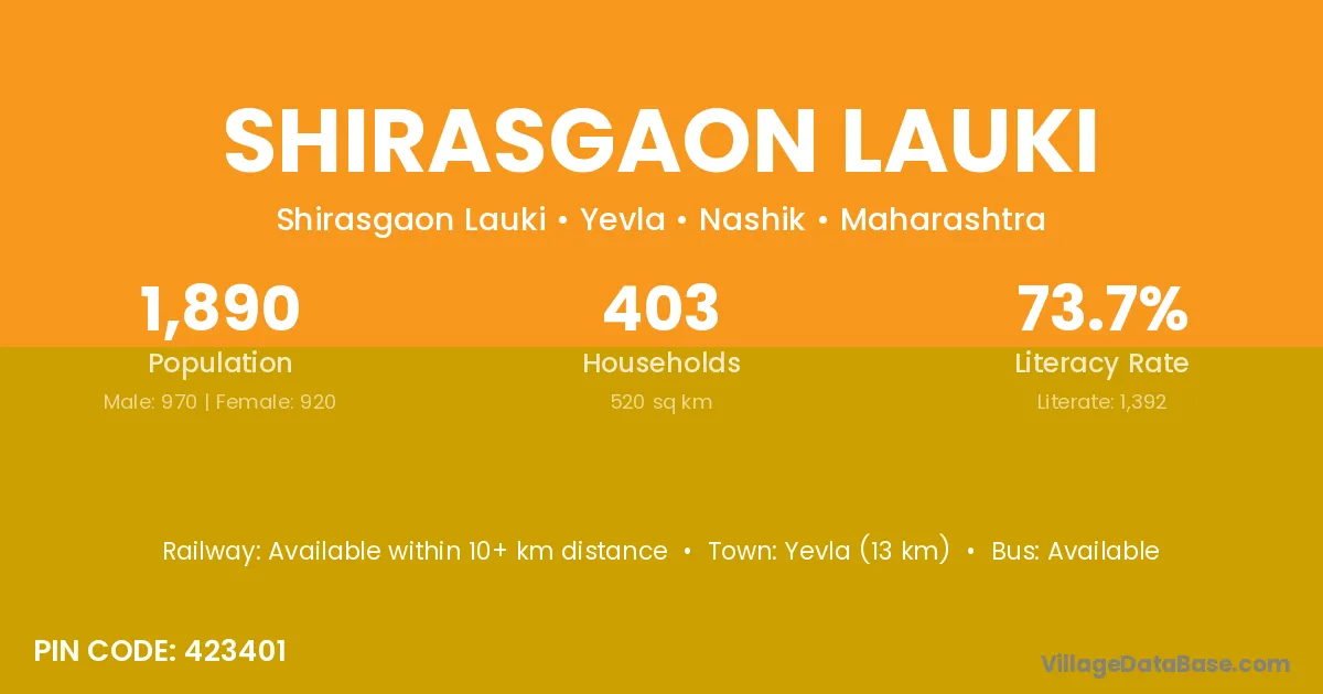 Shirasgaon Lauki village has a total population of 1,890 people, of which 970 are males and 920 are females.