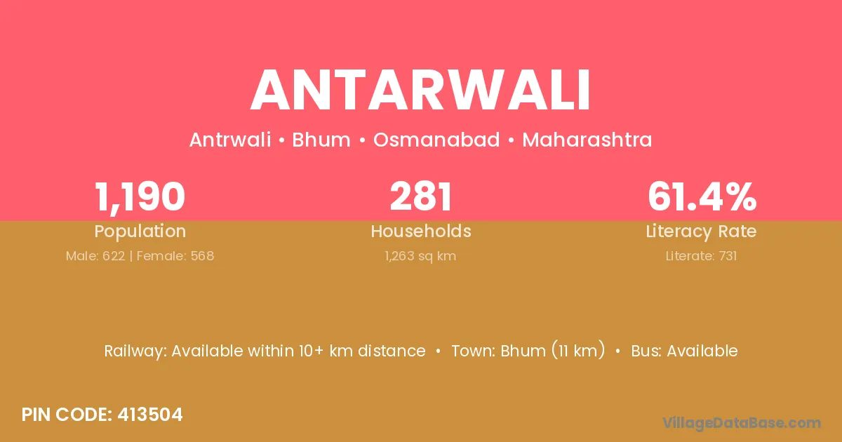 Bhum (11 km) is the nearest town to Antarwali village for major economic activities and is located approximately 11 km away.