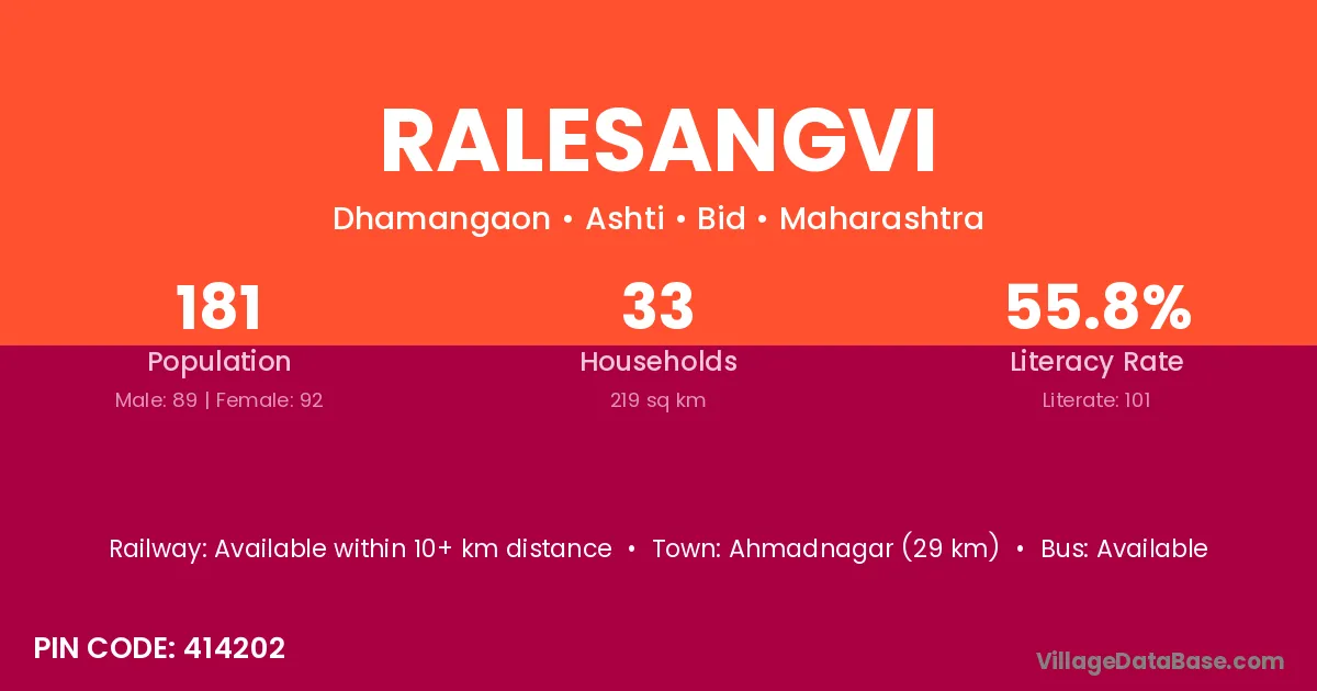 Bhum (13 km) is the nearest town to Ralesangvi village for major economic activities and is located approximately 13 km away.