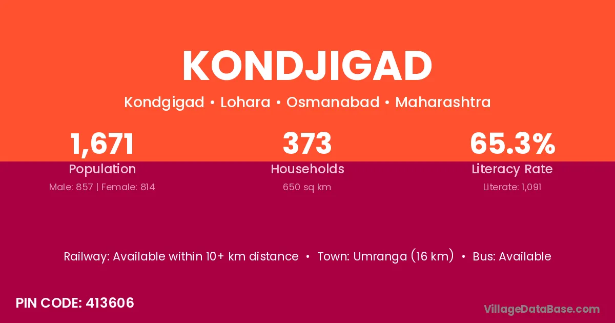 Kondjigad village has a total population of 1,671 people, of which 857 are males and 814 are females.
