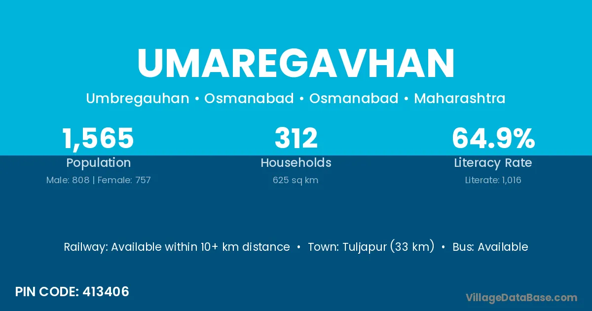 Tuljapur (33 km) is the nearest town to Umaregavhan village for major economic activities and is located approximately 33 km away.