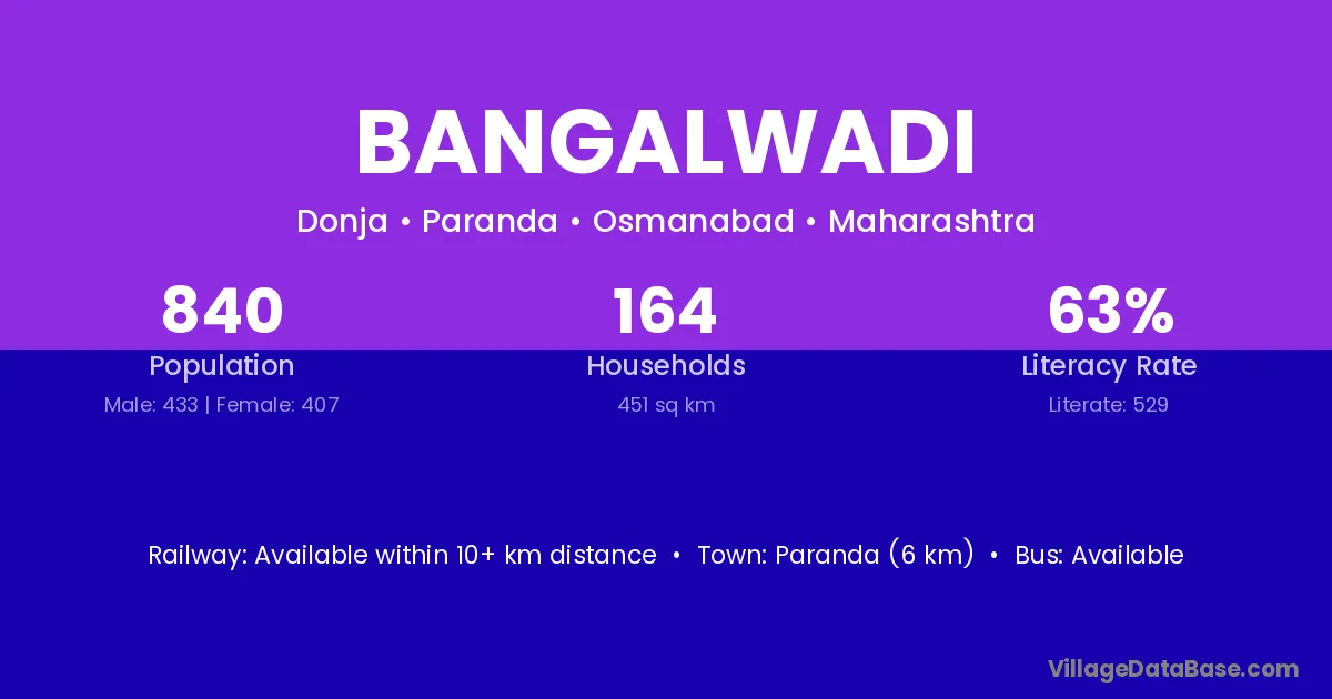 Paranda (6 km) is the nearest town to Bangalwadi village for major economic activities and is located approximately 6 km away.