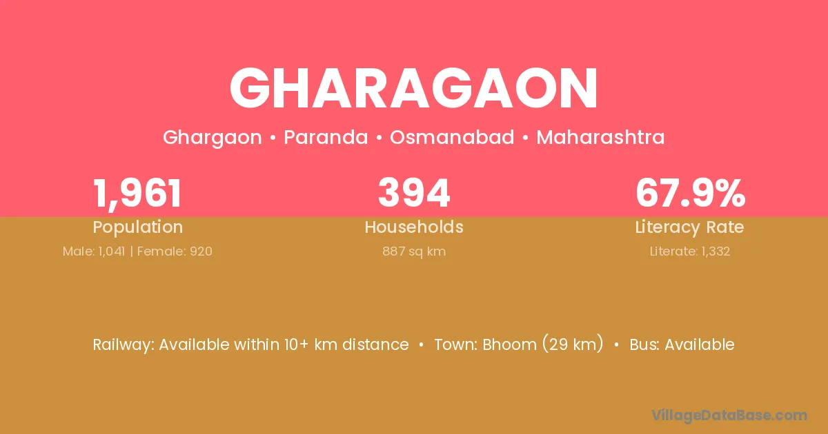 Bhoom (29 km) is the nearest town to Gharagaon village for major economic activities and is located approximately 29 km away.