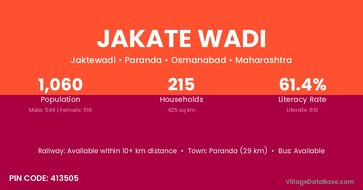 Paranda (29 km) is the nearest town to Jakate Wadi village for major economic activities and is located approximately 29 km away.
