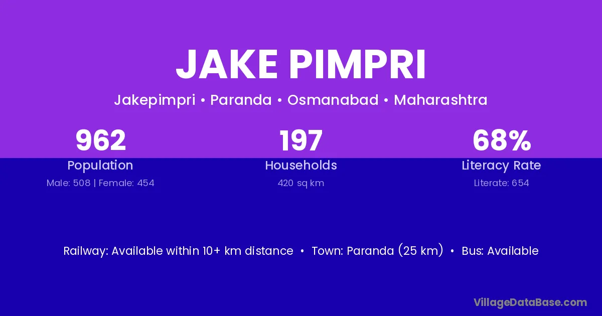 Paranda (25 km) is the nearest town to Jake Pimpri village for major economic activities and is located approximately 25 km away.