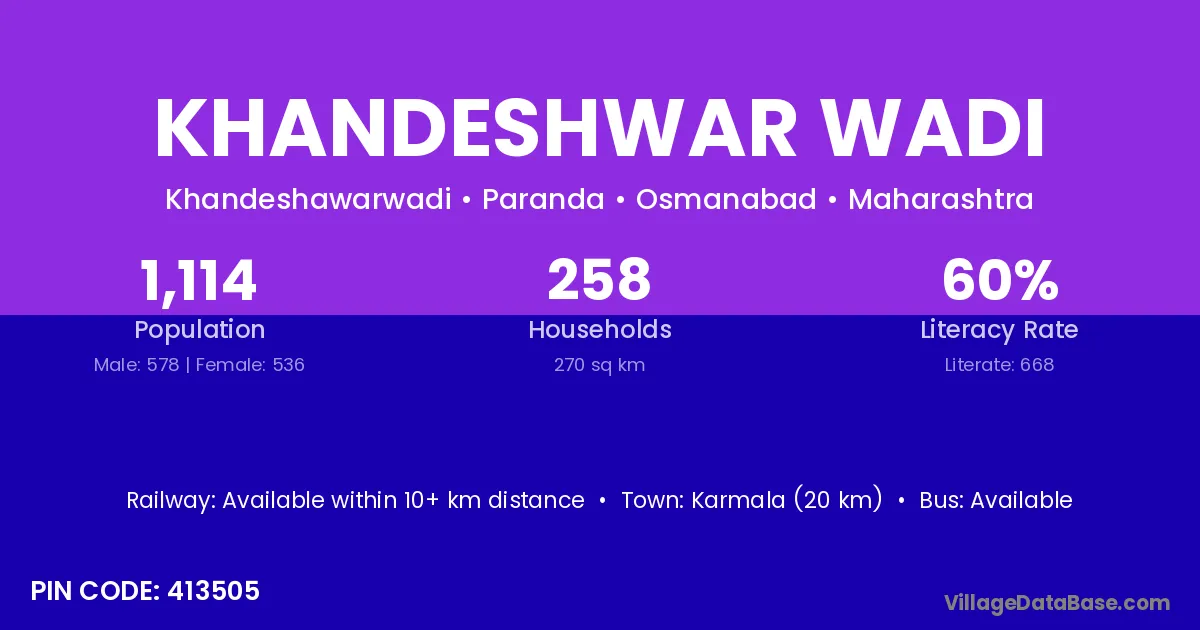 Khandeshwar Wadi village has a total population of 1,114 people, of which 578 are males and 536 are females.