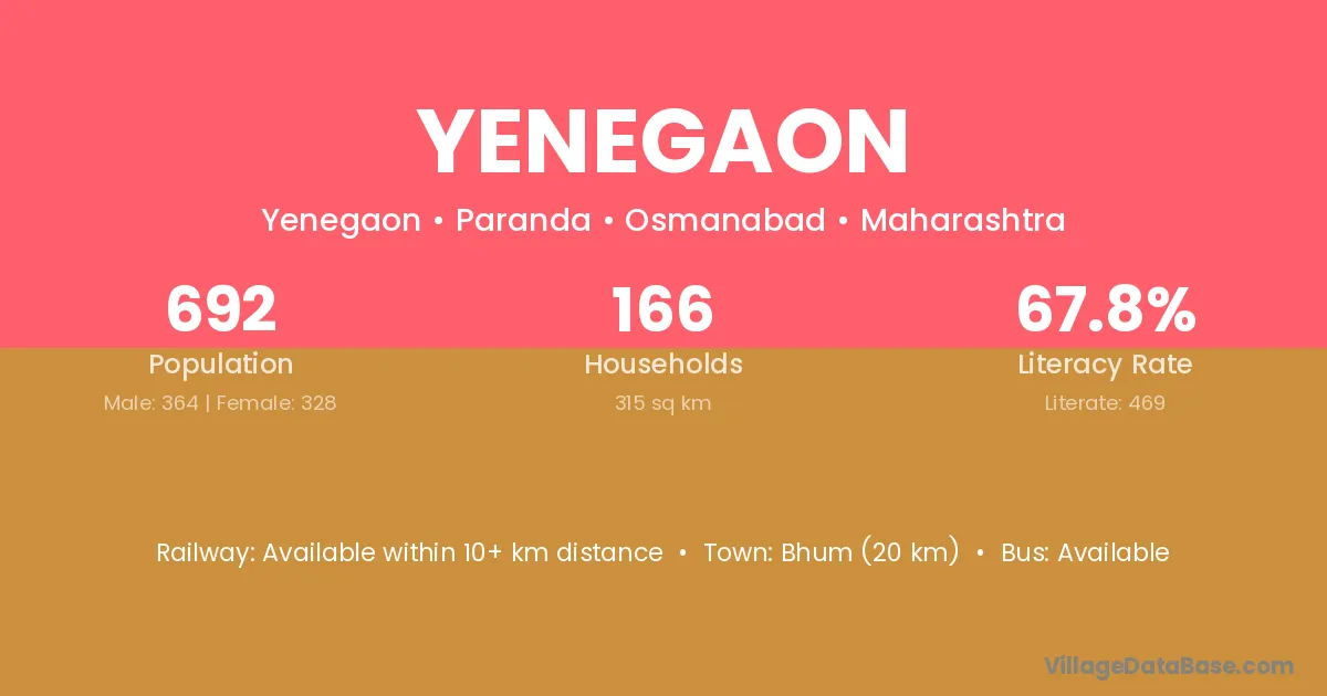 Yenegaon village has a total population of 692 people, of which 364 are males and 328 are females.