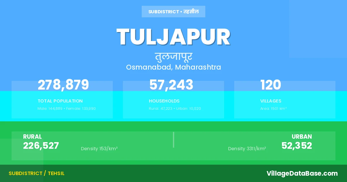 According to the 2011 census The total area of Tuljapur Tehsil is 1501 km², with a population of 278879 people. The population density is 186 inhabitants per square kilometre, and there are approximately 57243 houses in the sub district.