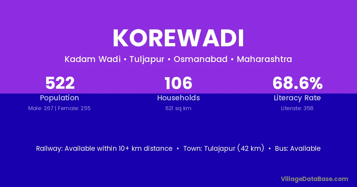 Tulajapur (42 km) is the nearest town to Korewadi village for major economic activities and is located approximately 42 km away.