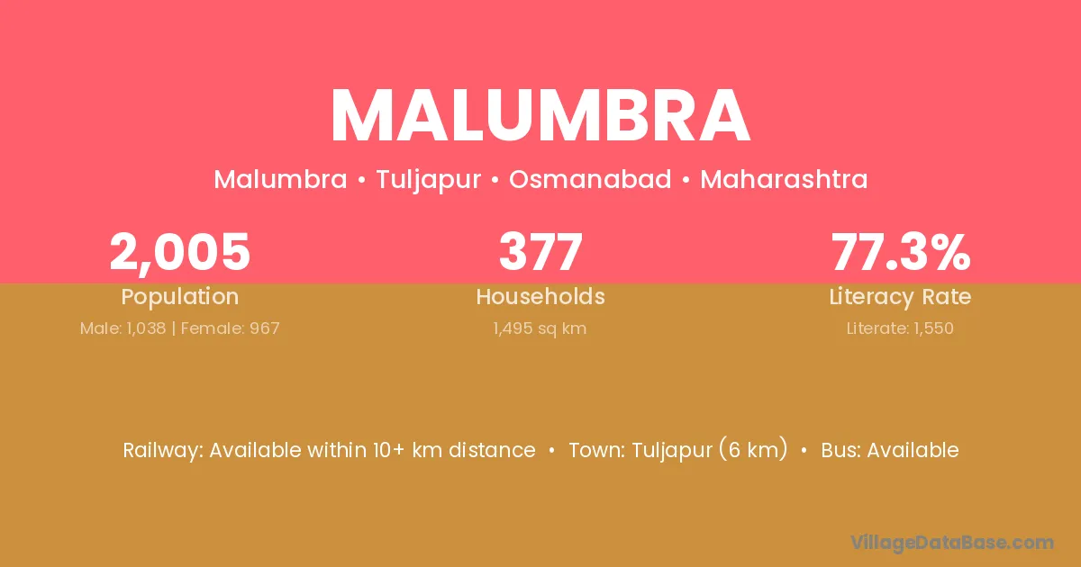 Tuljapur (6 km) is the nearest town to Malumbra village for major economic activities and is located approximately 6 km away.