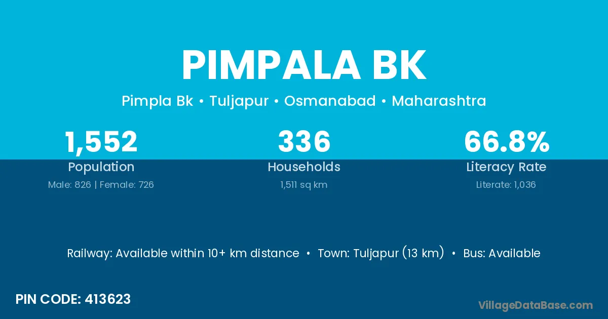 Tuljapur (13 km) is the nearest town to Pimpala Bk village for major economic activities and is located approximately 13 km away.