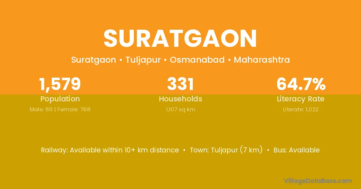 Tuljapur (7 km) is the nearest town to Suratgaon village for major economic activities and is located approximately 7 km away.