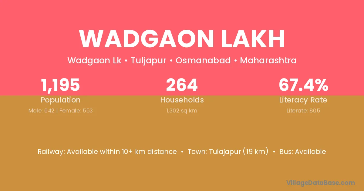 Wadgaon Lakh village has a total population of 1,195 people, of which 642 are males and 553 are females.