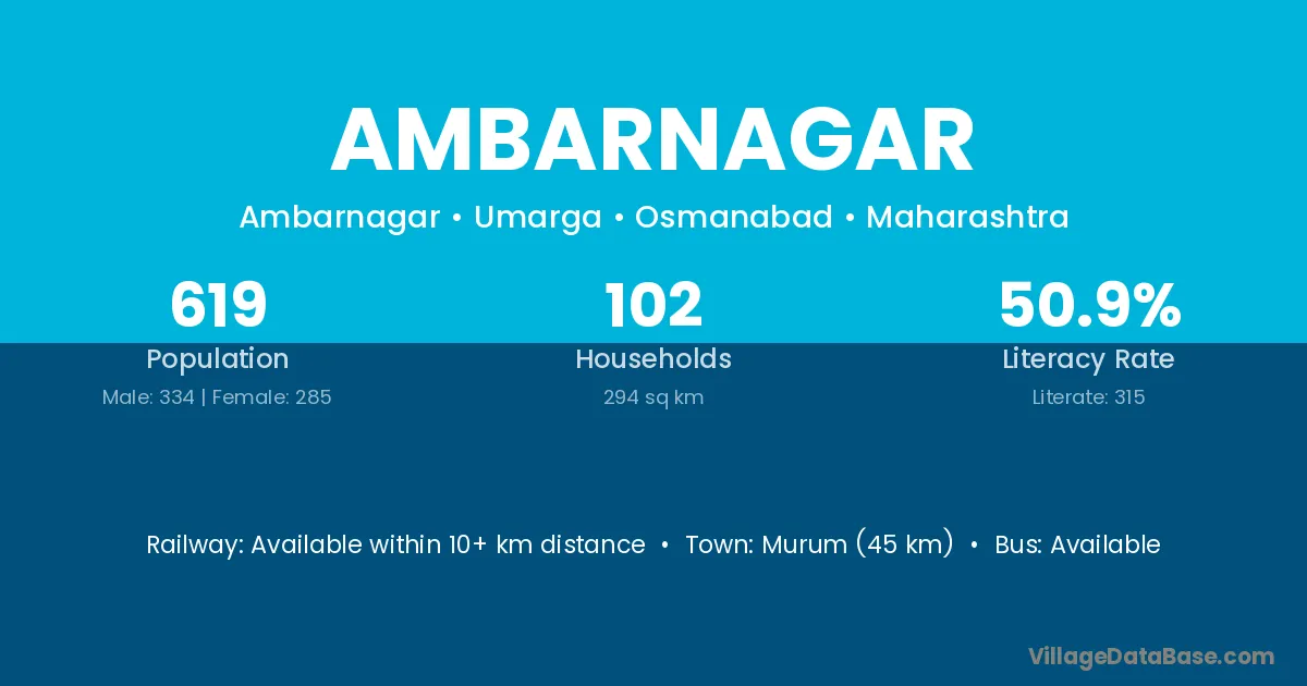 Murum (45 km) is the nearest town to Ambarnagar village for major economic activities and is located approximately 45 km away.