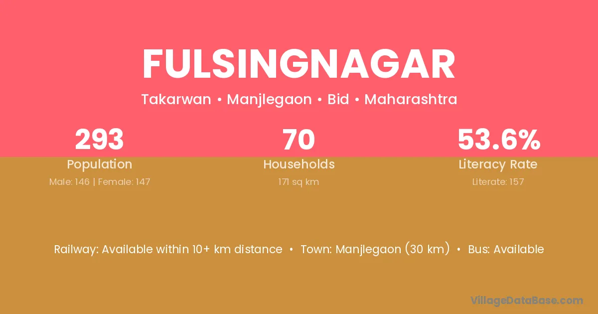 Murum (41 km) is the nearest town to Fulsingnagar village for major economic activities and is located approximately 41 km away.