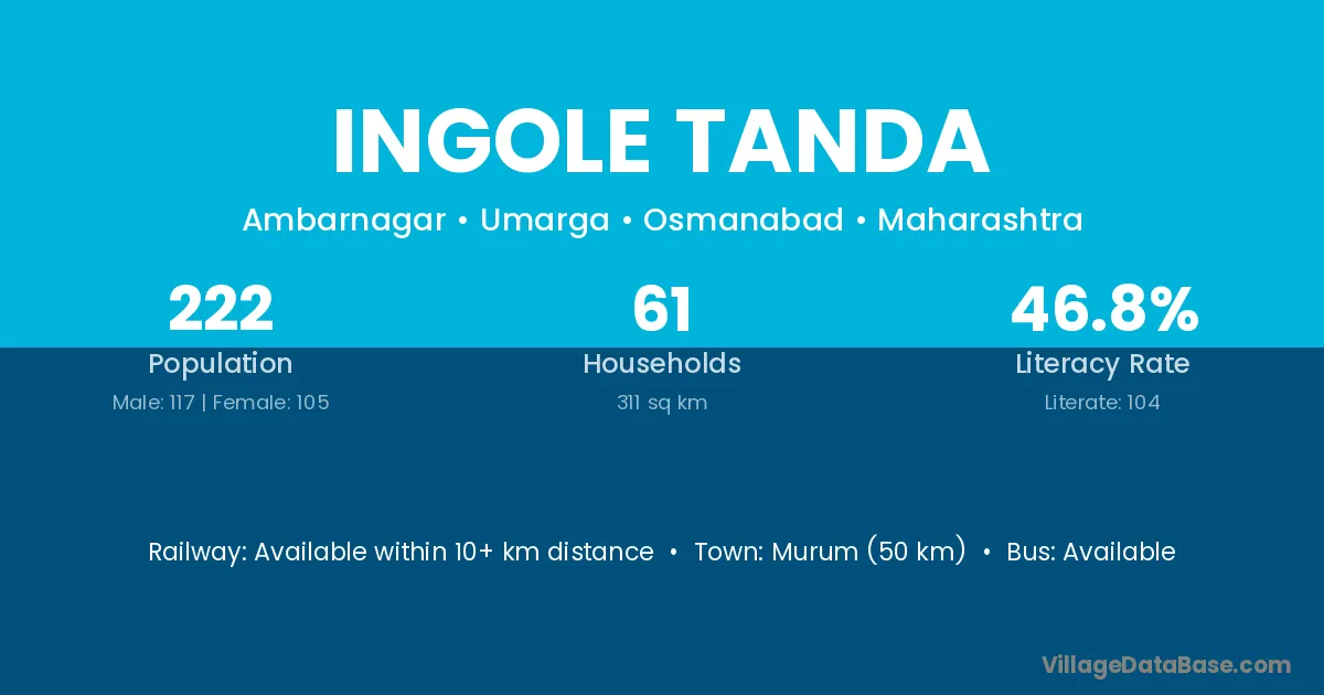 Murum (50 km) is the nearest town to Ingole Tanda village for major economic activities and is located approximately 50 km away.