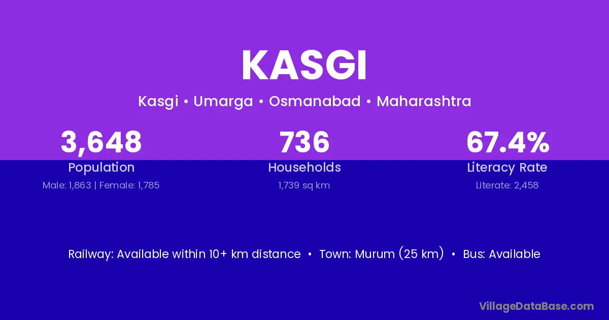 Kasgi village has a total population of 3,648 people, of which 1,863 are males and 1,785 are females.