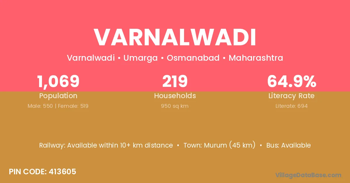 Varnalwadi village has a total population of 1,069 people, of which 550 are males and 519 are females.