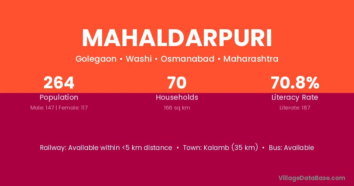 Kalamb (35 km) is the nearest town to Mahaldarpuri village for major economic activities and is located approximately 35 km away.